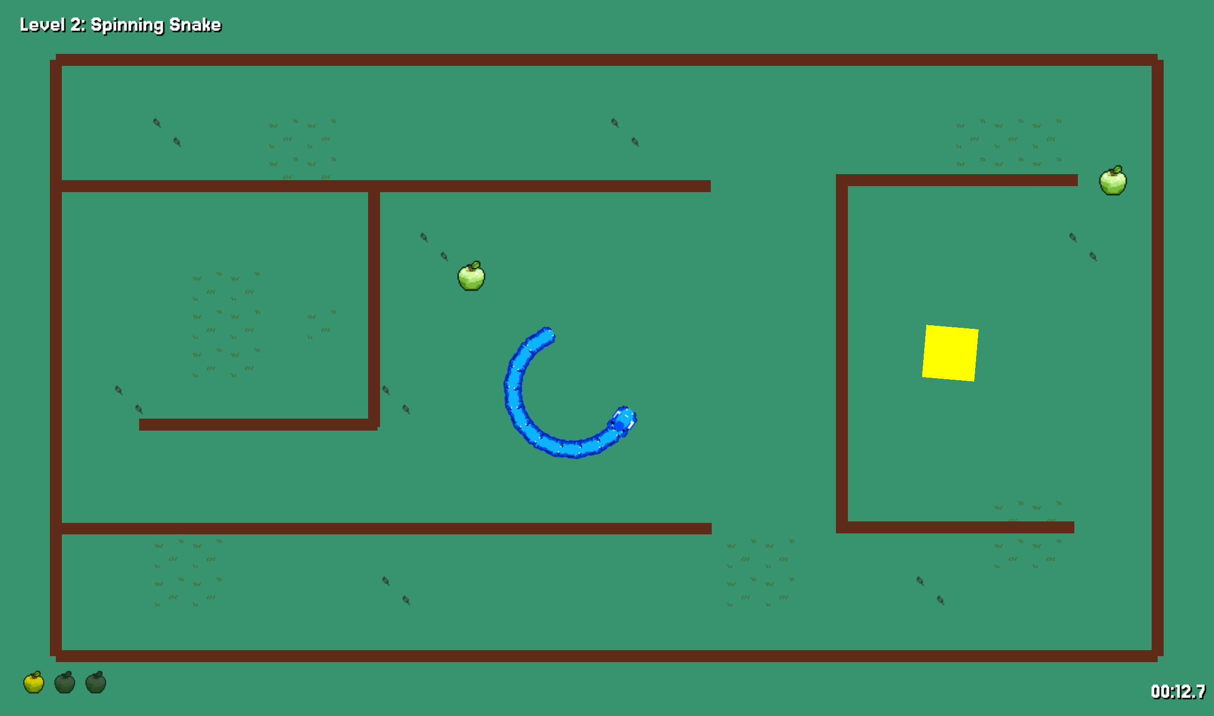 In Rotosnake if the player does not input any direction then the snake will loop either clockwise or anti-clockwise perpetually. This limited control scheme means you need to plan ahead and snake your way to the goal. Tactically looping to wait for obstacles to pass.
